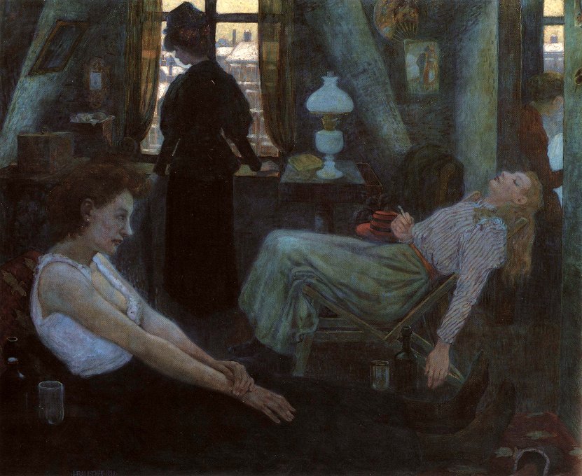 I suoi temi preferiti includevano fabbriche, cimiteri e soprattutto i comuni lavoratori: ad esempio, il suo Lavoro di mezzogiorno (Mittag) del 1894 raffigura donne con bambini che portano cestini per il pranzo ai loro uomini impiegati nelle fabbriche; ed evoca la “fatica infinita” della vita della classe operaia, con la sua costante ripetizione delle attività quotidiane. Questo si avvicina di molto al suo pensiero socialdemocratico e marxista.